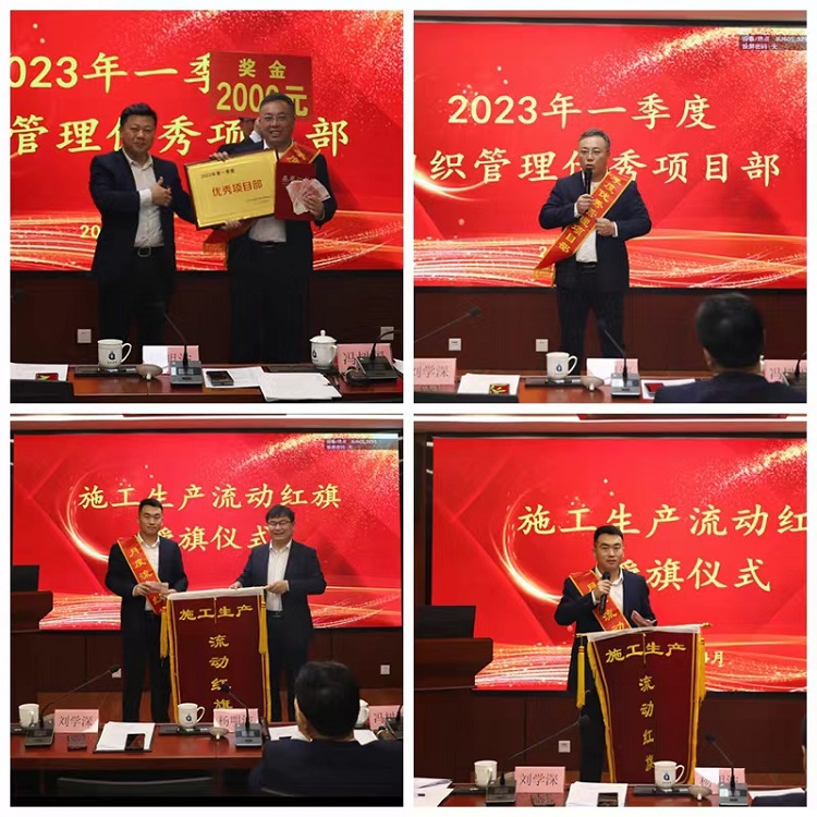 会上,表彰了季度优秀管理项目部(G1-2项目部),并向获得月度流动红旗的项目部(B5项目部)授旗,获奖项目负责人做了经验分享和表态发言。