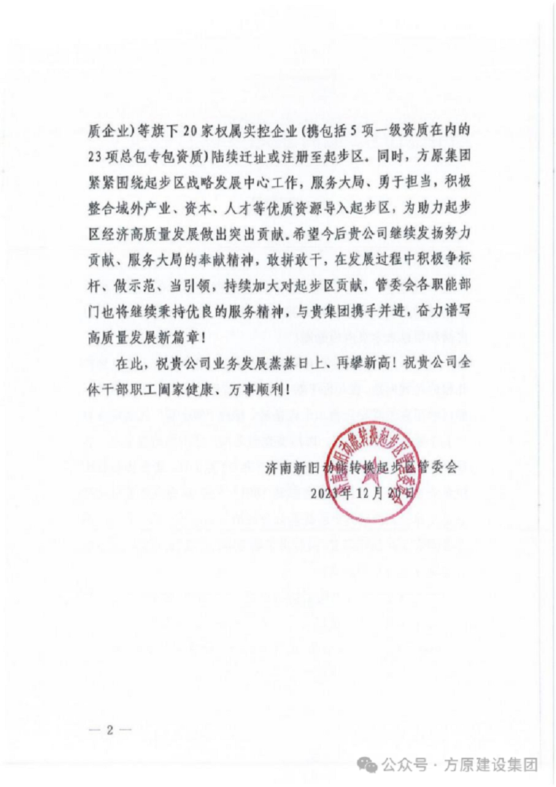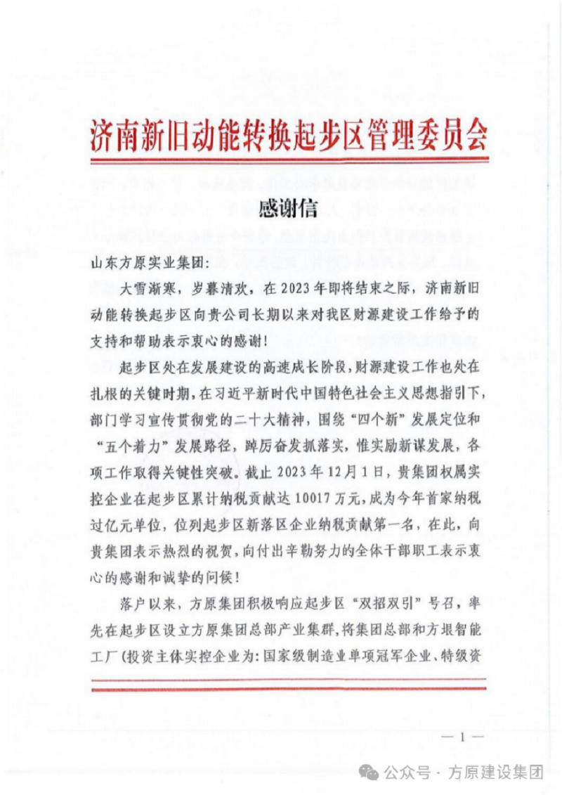 公海赌赌船官网jc710集团位列新落区企业纳税贡献第一名,济南新旧动能转换起步区管理委员会发来感谢信!