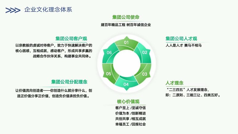 杨总指出,企业文化是一个企业的根脉,是一个企业基业长青的立身之本。集团公司一直秉承着“建百年精品工程,树百年诚信企业”的集团使命,践行“客户至上,至诚守信;价值为本,创新精进;共创共享、相互成就;幸福员工,回报社会” 的企业核心价值观,始终坚持 “人人是人才,赛马不相马” 的人才观,坚定认为人才是赛出来的,不是相出来的,始终坚持“让价值流向创造者”的价值分配理念,绝不让创造者吃亏。