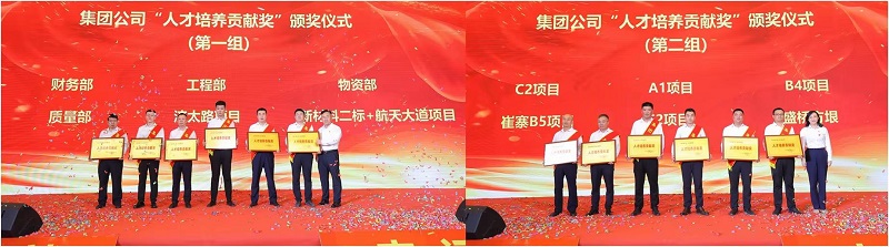 “人才培养贡献奖”颁奖典礼上,集团公司对在人才培养工作中作出突出贡献的财务部、工程部、物资部、质量部、盛桥公司、C2项目、A1项目、B4项目、B5项目、E2项目、济太路、新材料二标等12个集体给予表彰!